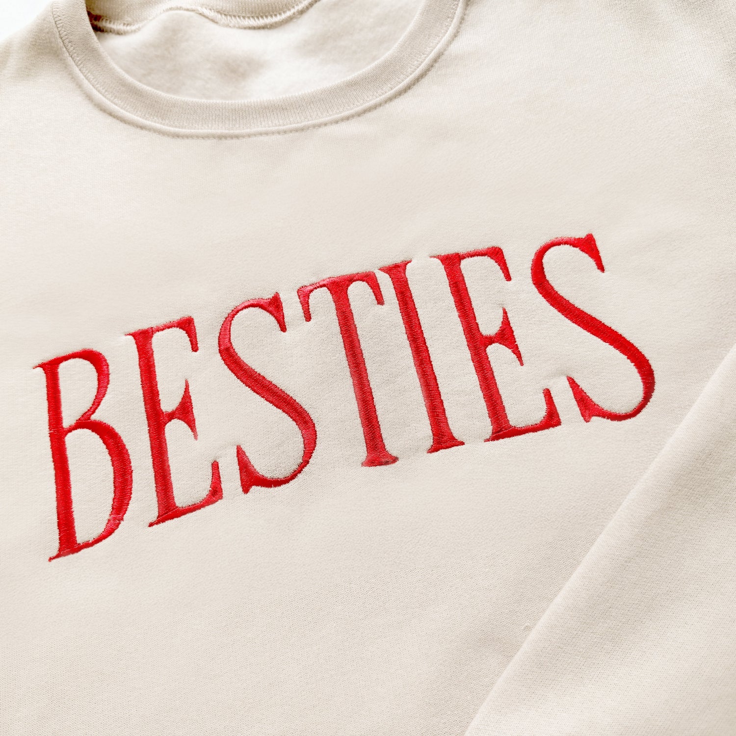 Each piece is handmade to order and features “Besties” embroidered across the chest in any thread color of your choosing. This means every set is made just for you and your littles—unique, personal, and perfectly matched.