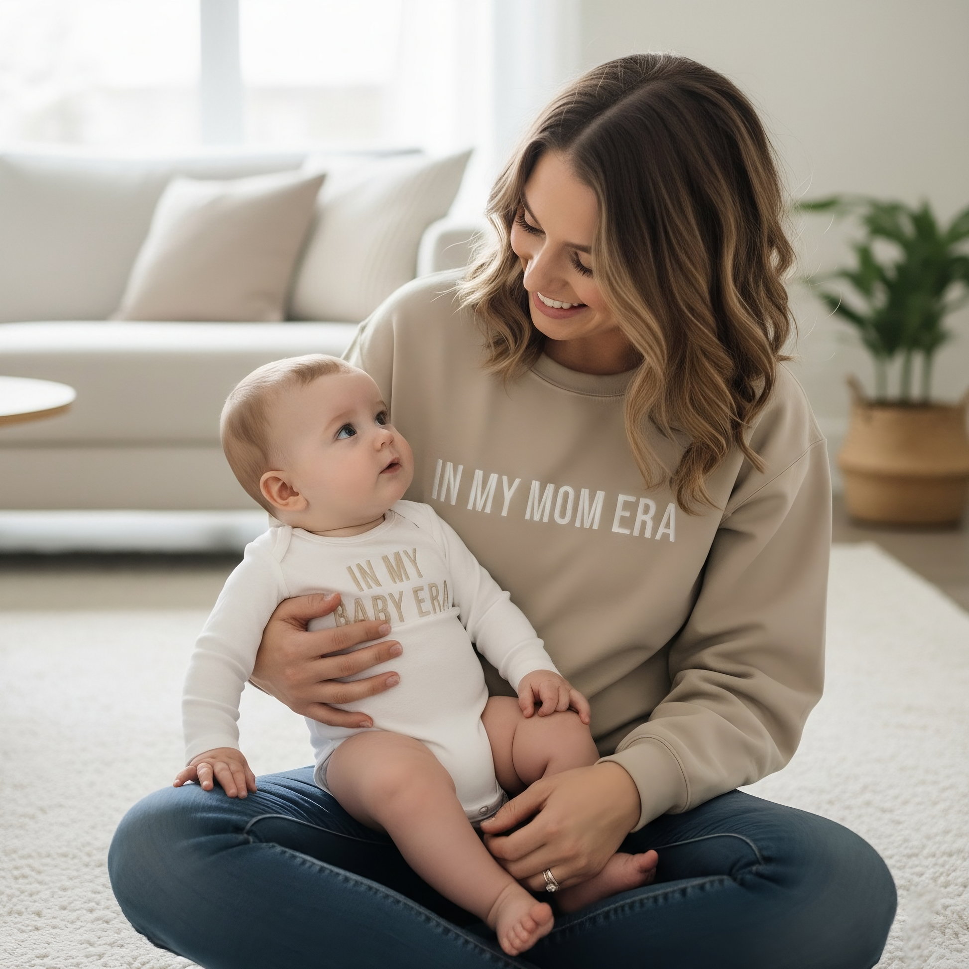 Celebrate motherhood and your love for Taylor with our "In My Mom Era" embroidered sweatshirt and "In My Baby Era" baby outfit sets — the perfect Taylor-inspired matching outfits for moms and their little ones. These trendy embroidered pieces make thoughtful gifts for new moms, adorable mommy and me photo shoots, and cozy coming home from the hospital outfits.