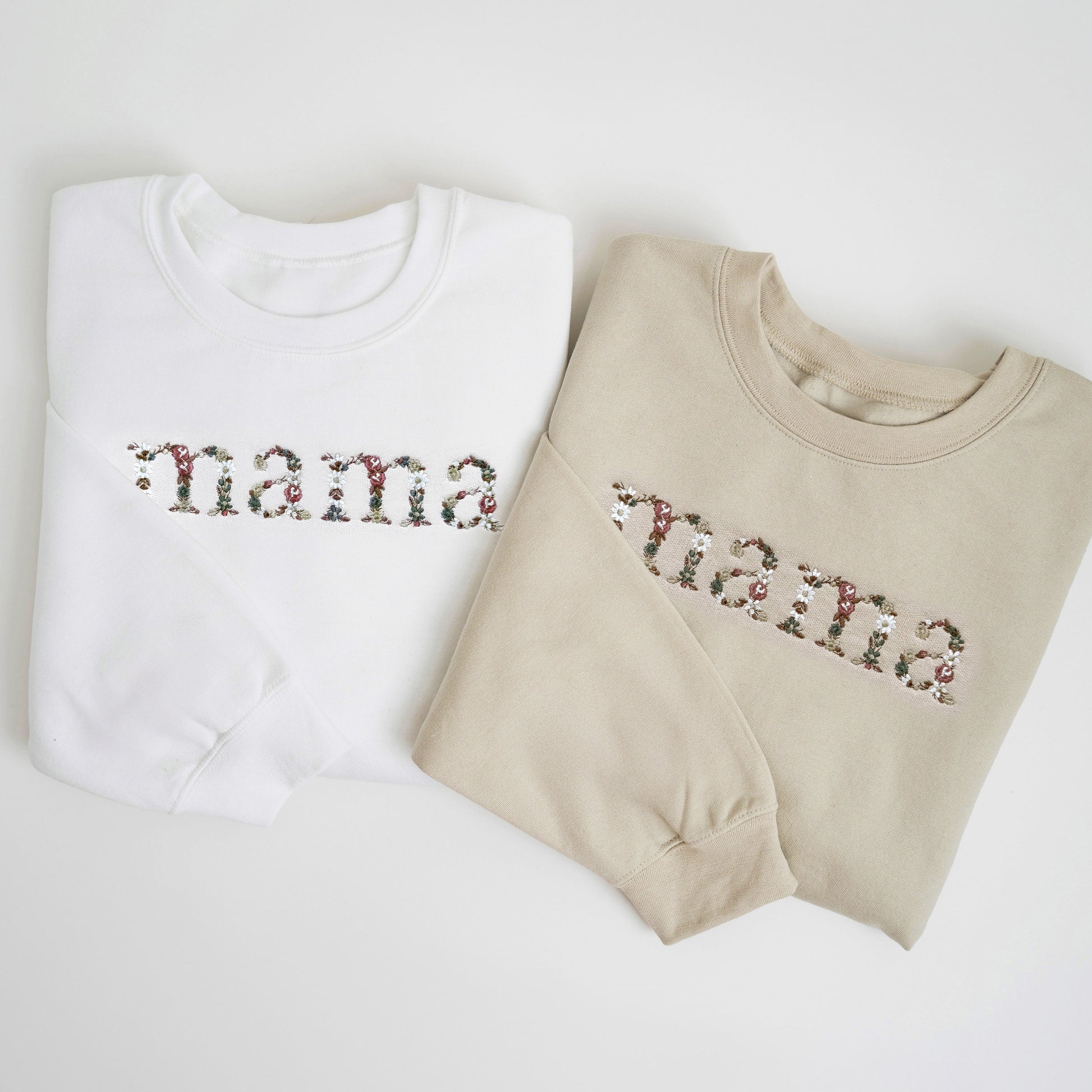 • Elegant neutral floral “mama” embroidery