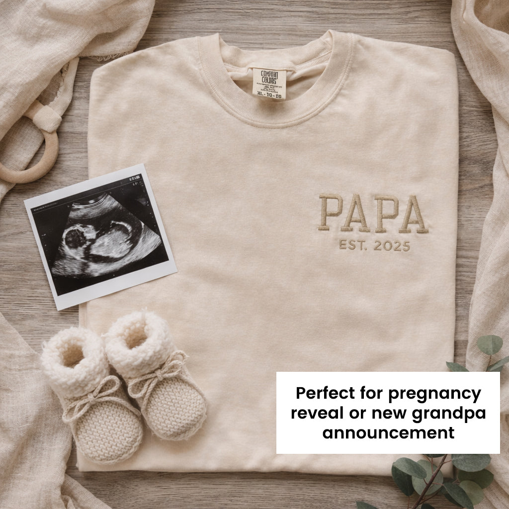 Celebrate the moment he officially became Dad, Papa, or Grandpa with a personalized embroidered Comfort Colors® tee designed to feel meaningful without being over the top. Clean, classic, and made to last, this custom shirt turns a simple essential into a keepsake he’ll reach for again and again.