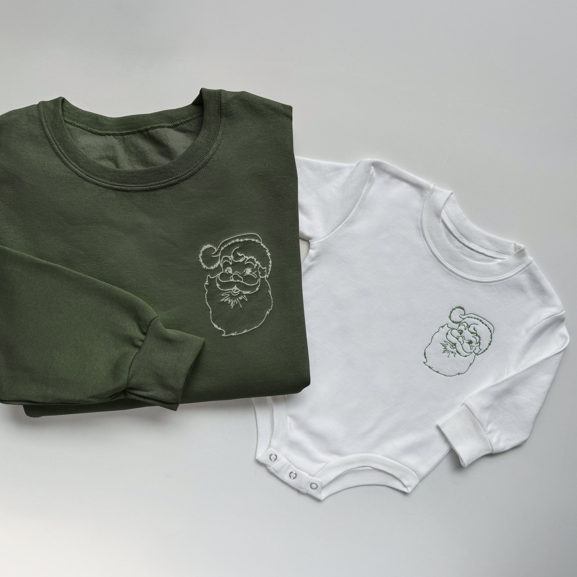 Each piece is detailed with an embroidered Retro Santa design, customizable in your favorite thread color. The premium cotton blend keeps things soft and comfortable for both parents and little ones, while the embroidery adds a touch of heirloom quality that lasts long after the holidays are over.